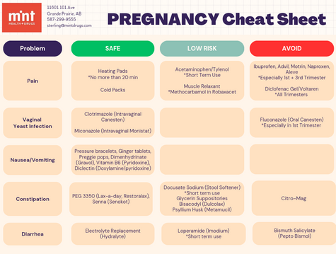 OTC Direction. There are many products that are not safe to use during pregnancy and a Pharmacist can help steer you in the right direction for issues including cough, colds, constipation, pain, yeast infections, and more. Check out the attached Pregnancy cheat sheet for common OTC meds you may use!